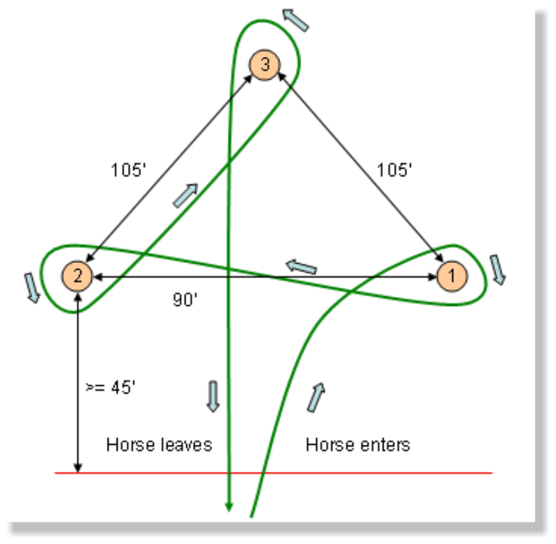 The diagram below, shows the course initially consisted of a figure-eight pattern, but was subsequently replaced by the favored clover-leaf course. This newer course demands a higher skill level for horse and rider to perfect. It is a test of synchronicity between horse and rider at speed.
